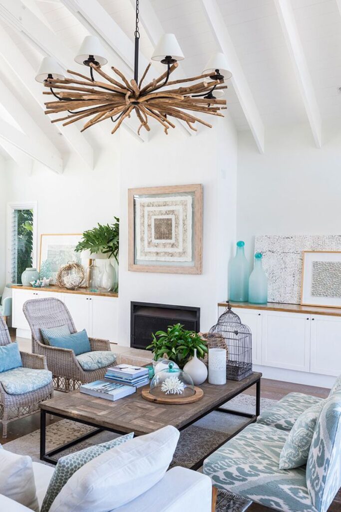 Layer in woven baskets, driftwood-inspired accessories, and ocean-themed artwork like surfboards, seashell prints, or watercolor waves. A chunky knit throw in aqua or a seashell garland can subtly tie the theme together.