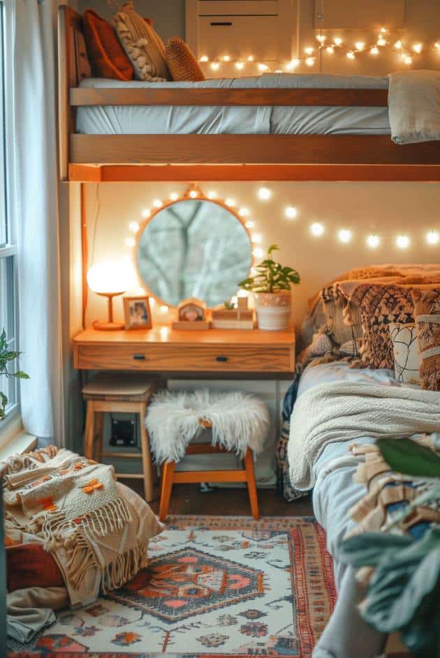 Stick with warm, desert-inspired colors like rust, terracotta, and sage green for your bedding and decor. Layered area rugs—yes, more than one—can define your space and add that cozy, collected feel. The result? A laid-back, wanderlust-inspired dorm that feels both grounded and stylish.