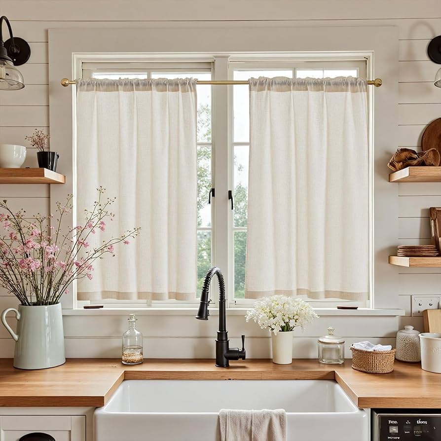 For a clean and timeless look, you can’t go wrong with classic white linen cafe curtains.
