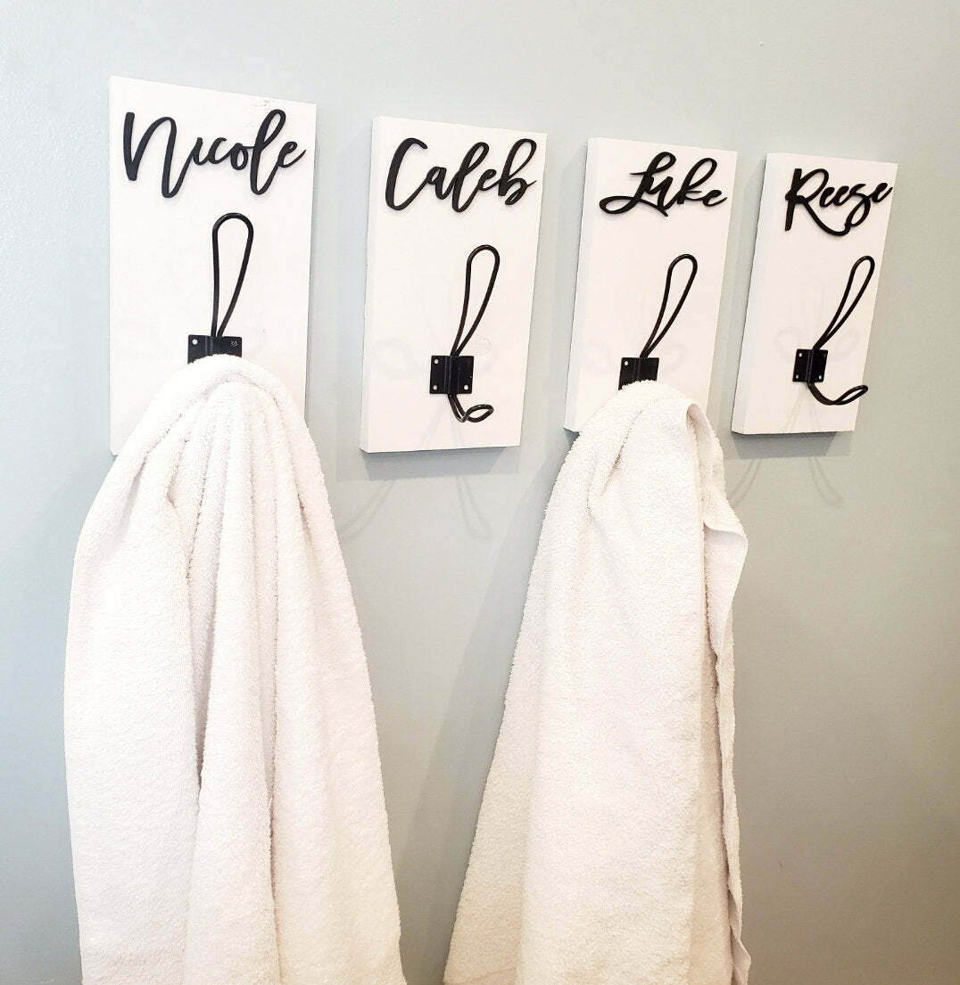 Sharing a bathroom? Personalized towel hooks are a cute and practical way to keep everyone’s stuff in order.