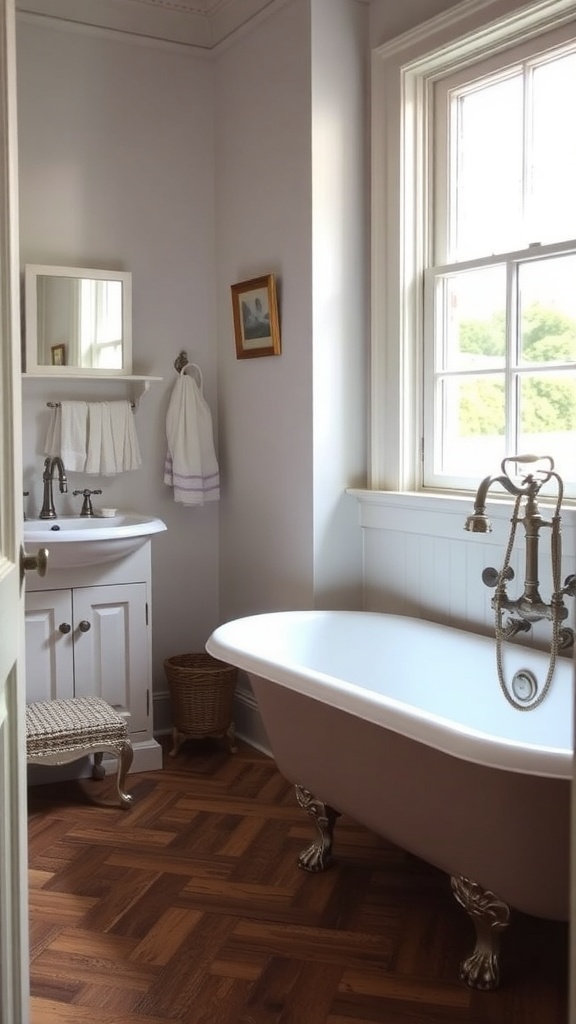 Antique fixtures can bring a unique charm to your country bathroom. They often serve as conversation starters and add a touch of history to your space. In the image, you can see a beautiful clawfoot bathtub that stands out with its elegant design and vintage appeal.