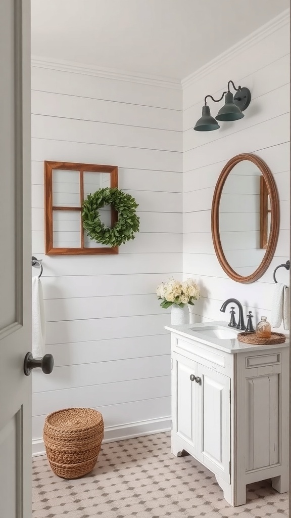 The combination of the shiplap with natural elements, like the wooden mirror and the green wreath, enhances the rustic charm. The soft colors and simple decor keep the space feeling open and airy. You can easily incorporate shiplap into your bathroom design, whether you cover all the walls or just create an accent wall.