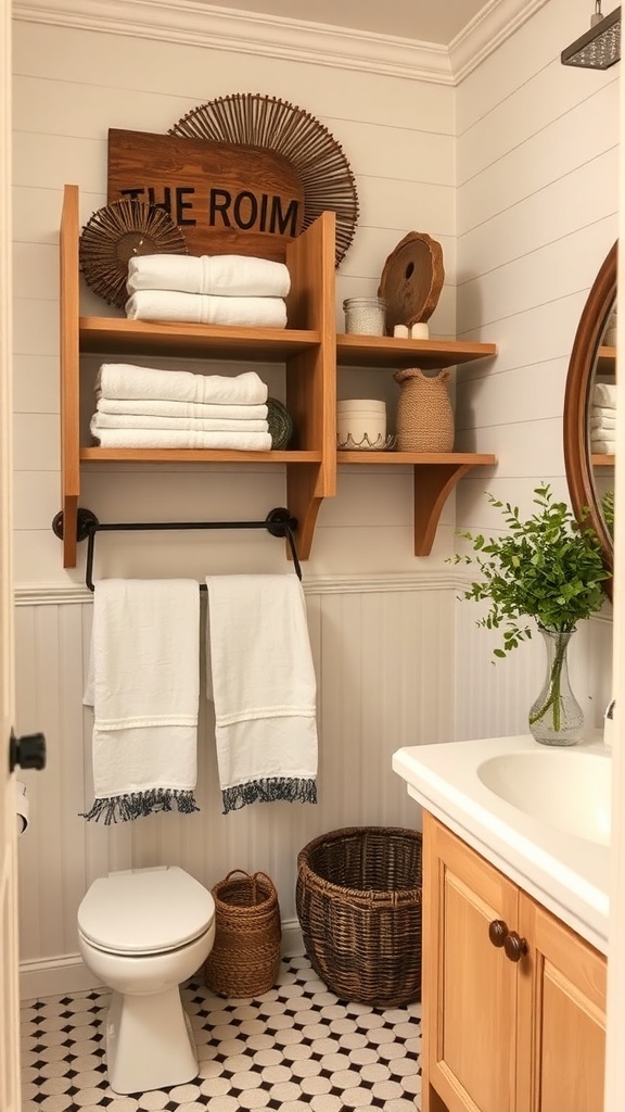 The natural wood tones of the shelves contrast nicely with the white walls and accessories. This creates a warm, cozy vibe that fits perfectly in a country-style bathroom. The addition of a few decorative pieces, like the round wall decor and vases, adds personality without cluttering the space.