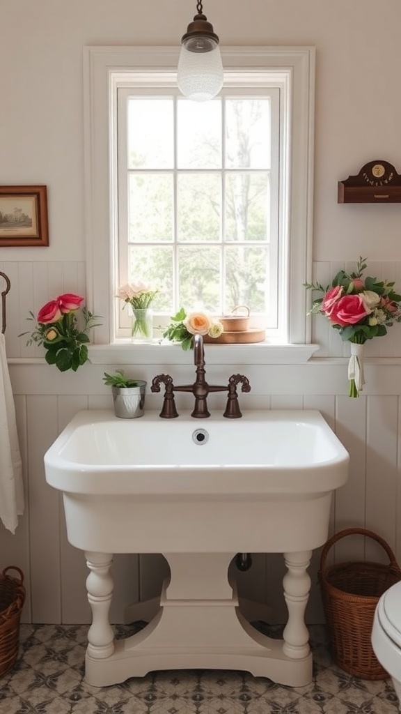 Surrounding the sink are fresh flowers and greenery, which brighten the space and bring a bit of nature indoors. The large window allows natural light to flood in, making the bathroom feel airy and inviting. The soft color palette and vintage accents complete the cozy farmhouse vibe.