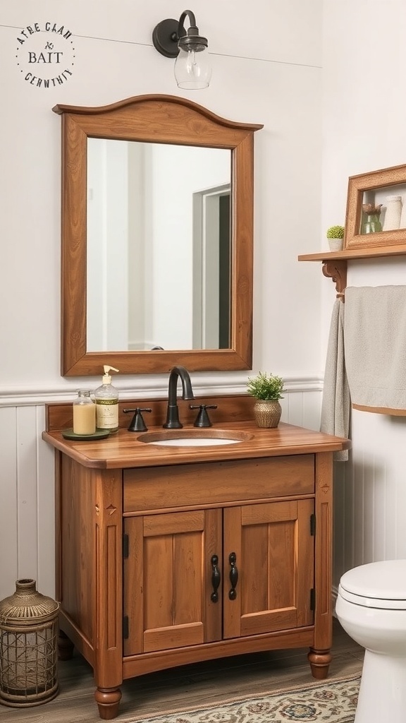 Above the vanity, a stylish mirror reflects light, making the bathroom feel more spacious. The addition of a small plant brings a hint of nature indoors, complementing the wooden elements beautifully. This setup is not just functional; it’s a lovely blend of rustic charm and modern convenience.