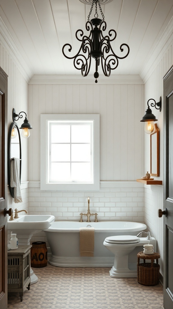 Rustic lighting fixtures can truly transform a bathroom, adding warmth and charm. In the image, we see a beautiful chandelier with intricate designs hanging from the ceiling. This piece stands out against the clean, white walls and brightens up the space.