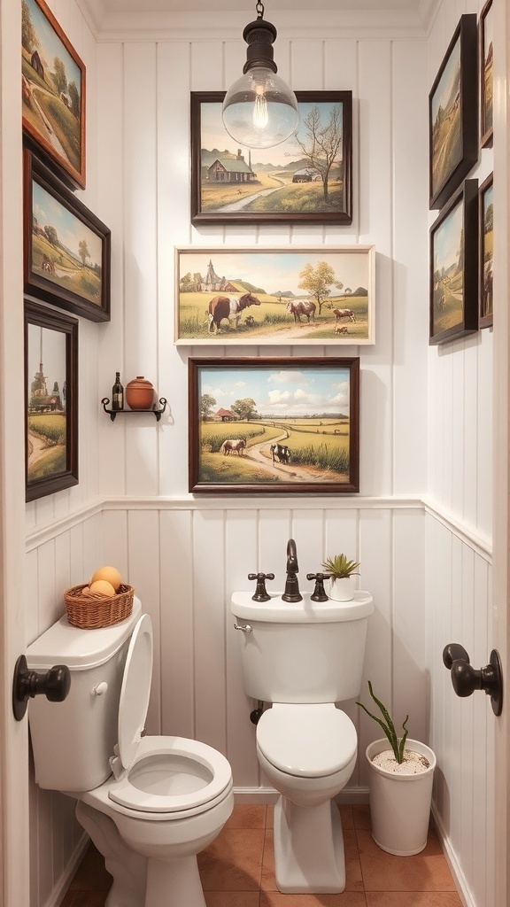 The choice of frames complements the rustic theme, enhancing the overall aesthetic. Each piece showcases charming scenes, such as farms and grazing animals, which resonate with the country vibe. This kind of decor can transform a simple bathroom into a delightful retreat.