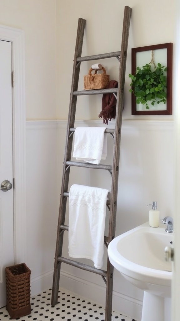 In the image, you can see the ladder leaning against the wall, showcasing white towels that contrast beautifully with the wood. The addition of a small basket and a framed plant enhances the overall aesthetic, creating a warm and welcoming atmosphere.
