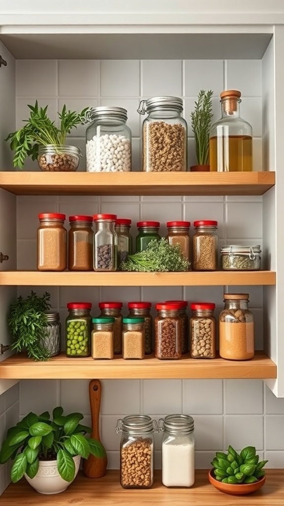 The jars are filled with a variety of ingredients, from herbs to sugars, making them easy to access while cooking. The vibrant red lids add a pop of color, contrasting nicely with the natural wood of the shelves. This setup encourages organization and makes it simple to see what you have on hand.
