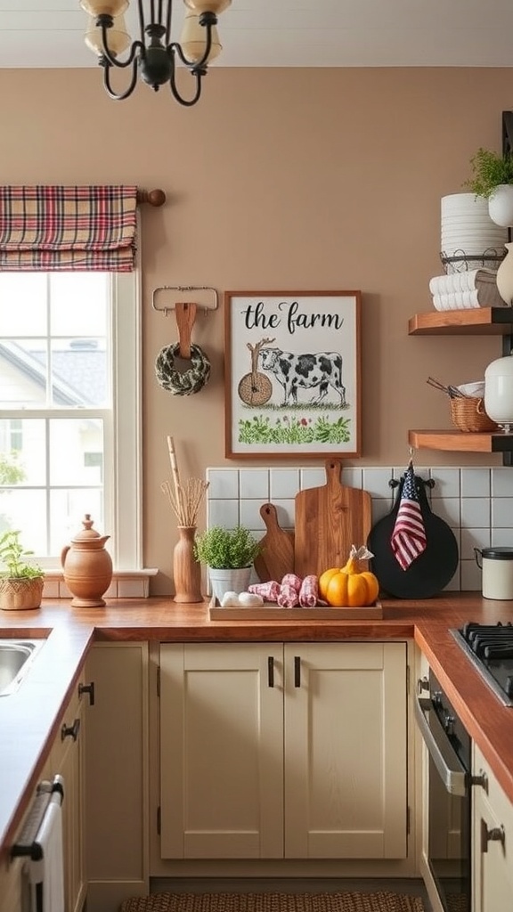 A charming accent wall can truly transform a kitchen, making it feel warm and inviting. In this kitchen, the soft beige wall color sets a cozy backdrop for farm-themed decor. A delightful framed artwork featuring a cow and the words ‘the farm’ adds a touch of rustic charm.
