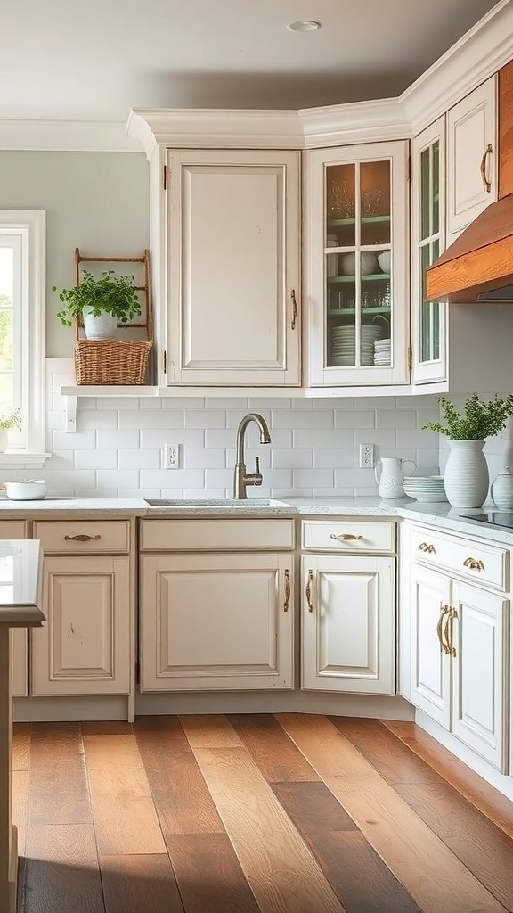 Details like glass-front cabinet doors allow you to showcase beautiful dishware or decorative items. Adding a few potted plants on the shelves brings a bit of nature indoors, enhancing the farmhouse vibe.