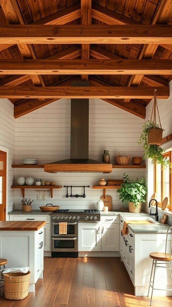 The high ceilings with exposed beams add a sense of openness. They draw the eye upward, making the kitchen feel larger and more airy. Shiplap walls enhance this effect, providing a clean and classic look that pairs well with various decor styles.