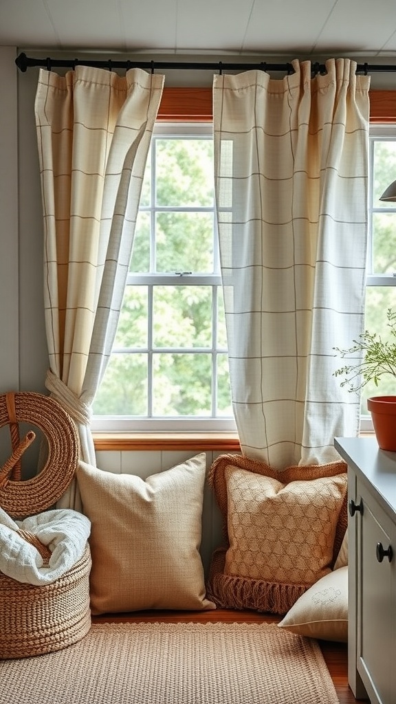 The warm color palette, featuring earthy tones, ties everything together beautifully. This combination of textiles creates a cozy nook, making it an ideal spot for morning coffee or afternoon chats. Incorporating these elements into your farmhouse kitchen can transform it into a welcoming retreat.