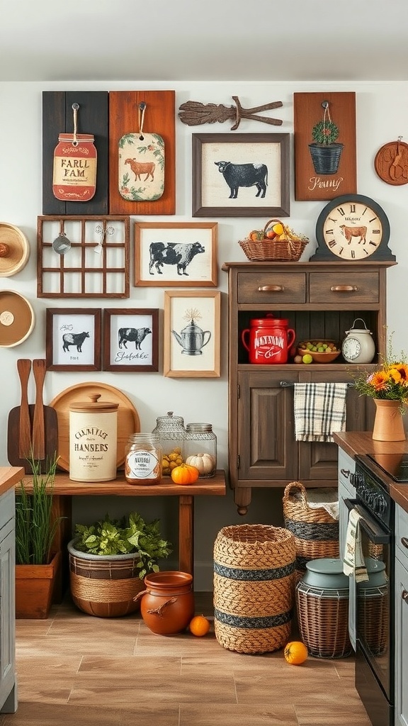 Farm-themed wall art brings a cozy and inviting feel to any kitchen. The image showcases a delightful arrangement of rustic decor that perfectly captures the essence of country living. From vintage signs to charming animal prints, each piece adds character and warmth.