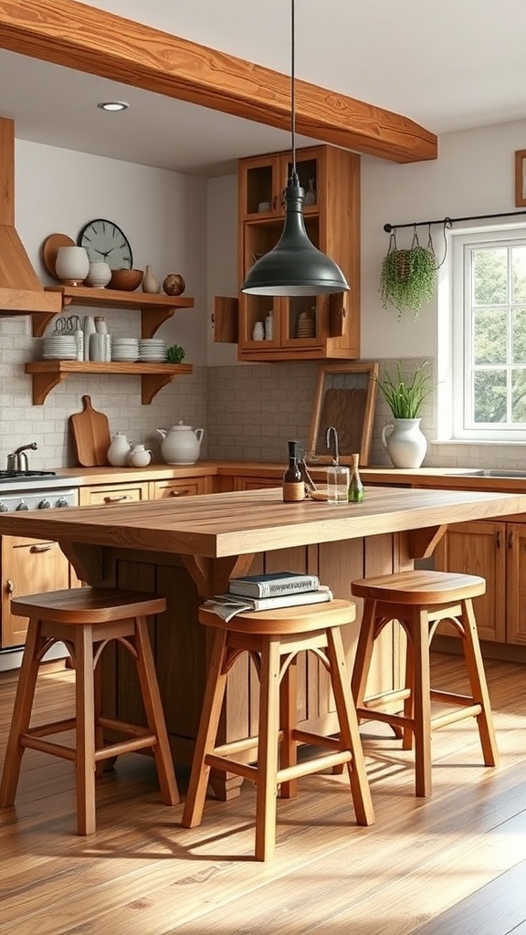 The island features a spacious countertop, perfect for meal prep or casual dining. Stools are neatly arranged on one side, making it a great spot for morning coffee or a quick snack. The simplicity of the design highlights the natural grain of the wood, adding a rustic charm to the kitchen.