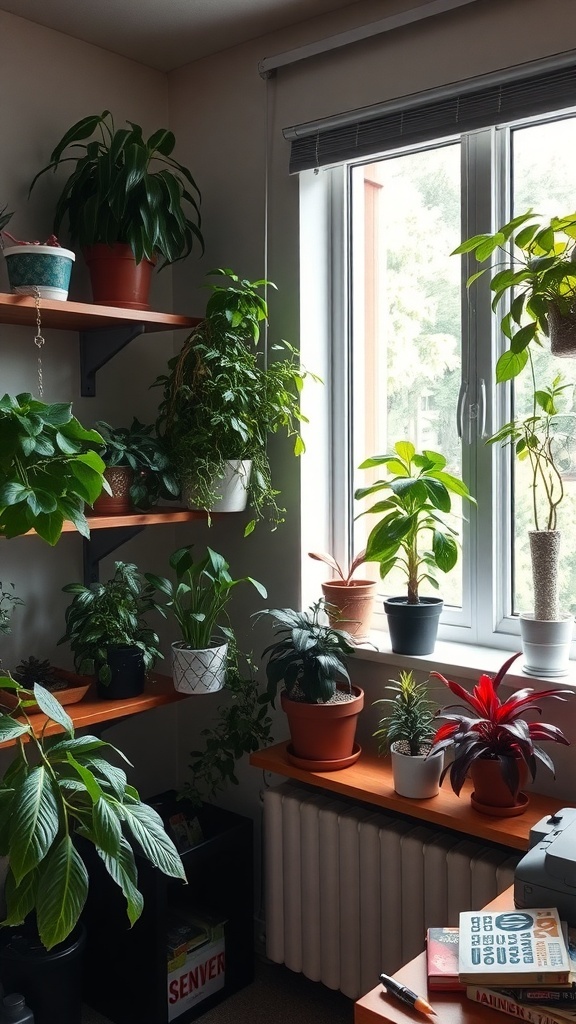 Adding plants to your dorm room can instantly brighten up the space. The image shows a cozy corner filled with various plants, showcasing how greenery can transform a simple room into a vibrant oasis.