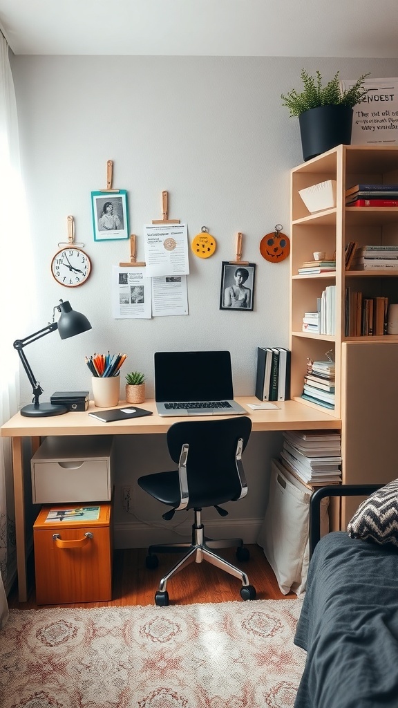 The desk features a sleek design with a laptop, a lamp, and some colorful stationery. This setup encourages creativity while keeping everything you need within reach. The addition of plants and personal touches, like photos and notes on the wall, adds a cozy vibe that makes studying feel less like a chore.