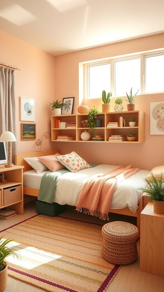 Natural elements, like the plants on the shelves and the woven rug, enhance the warmth of the room. The wooden furniture adds a touch of simplicity and comfort, making the space feel homey. This combination of colors and textures is ideal for creating a personal retreat in your dorm.