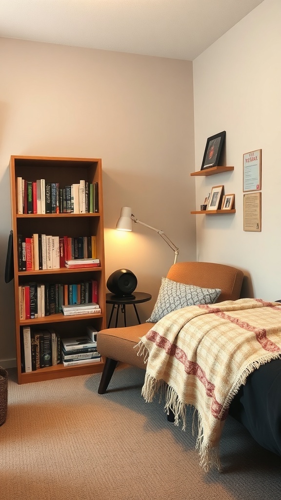 A cozy reading nook can transform any dorm room into a personal retreat. This space is perfect for curling up with a good book or enjoying some quiet time. The image showcases a comfortable chair paired with a warm blanket, inviting you to settle in and relax.