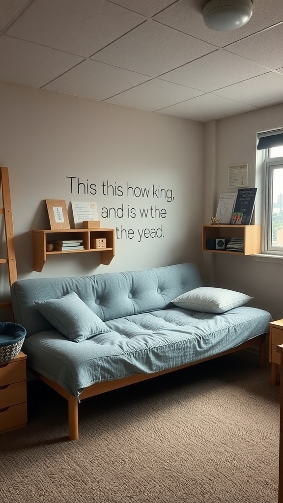The light blue color of the futon adds a soft touch, making the room feel inviting. A couple of pillows enhance comfort, inviting you to relax or study. The wooden frame gives it a warm, natural vibe, blending well with the overall decor.