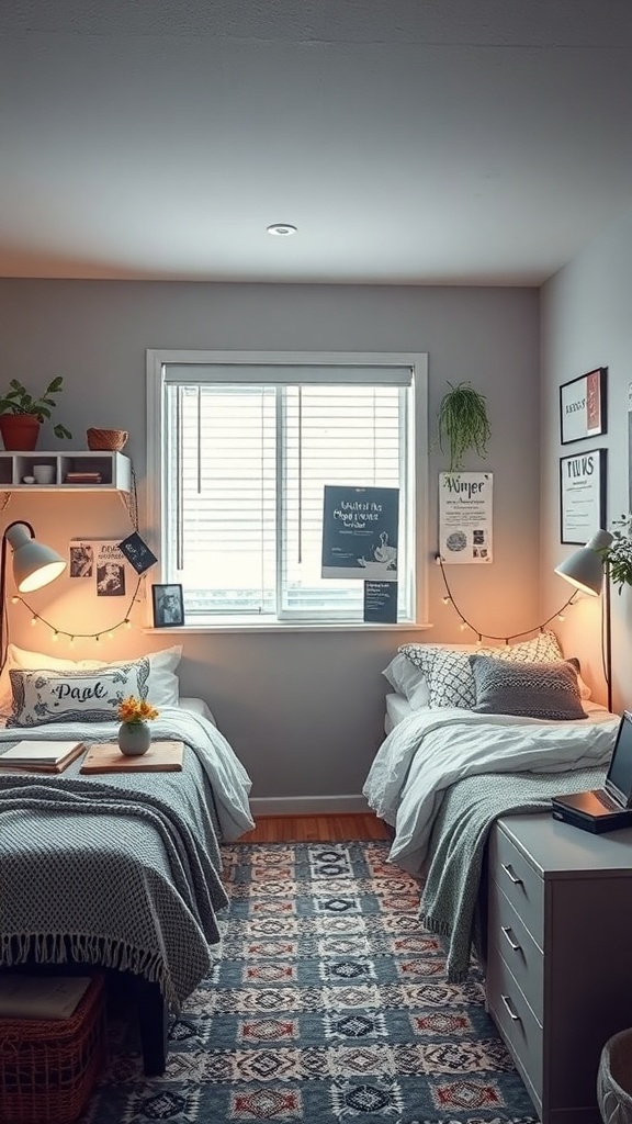 The image showcases a cozy dorm room that perfectly embodies the idea of themed decor. The space features two neatly made beds with soft, inviting blankets and pillows, creating a warm atmosphere. The color palette is calm and soothing, with shades of gray and touches of white, making it easy to relax and unwind.