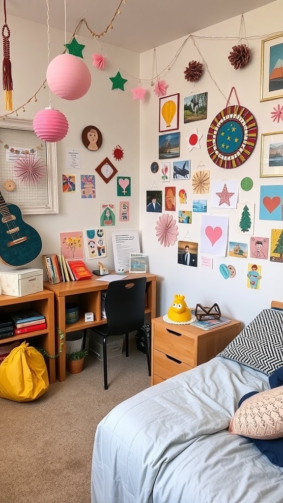 Transforming your dorm room into a cozy space is all about creativity. The image shows a vibrant room filled with personal touches. From colorful paper lanterns to a wall covered in art, it’s clear that DIY decor can make a big impact.