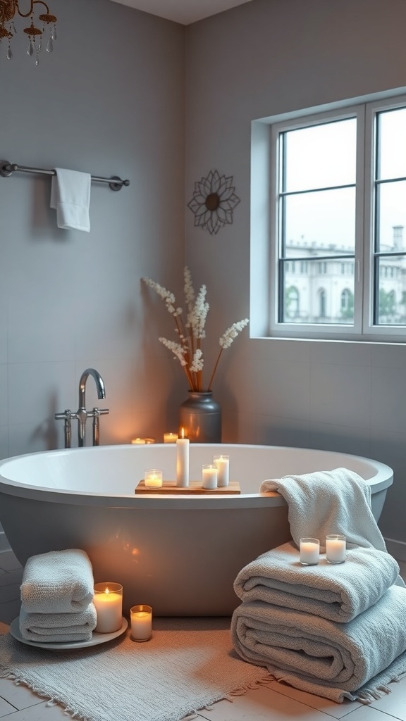 Picture a cozy bathroom where relaxation is the main goal. The tub is inviting, surrounded by soft, fluffy towels and glowing candles. This setup creates a warm and calming vibe, perfect for unwinding after a long day.