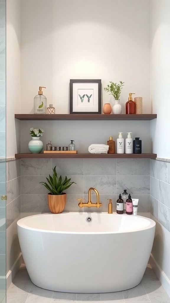 Floating shelves can transform your bathroom into a stylish retreat. In the image, you see two sleek wooden shelves mounted above a beautiful freestanding tub. These shelves are not just functional; they add a modern touch to the space.