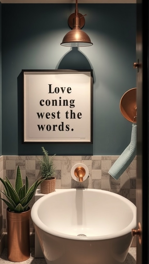 Wall art can really change the vibe of your bathroom. In this image, a simple yet striking piece hangs above a stylish tub. The artwork features the phrase ‘Love coning west the words,’ which adds a playful touch to the space.