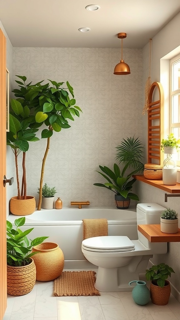 Nature-inspired decor brings a refreshing vibe to any bathroom. This image showcases a lovely bathroom filled with greenery and warm tones. The plants add life and color, making the space feel inviting and serene.