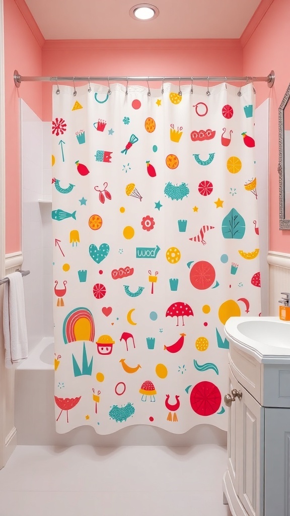 Shower curtains can really set the mood in a bathroom, and this design is a perfect example of how fun and playful they can be. The bright colors and quirky patterns bring a cheerful vibe to the space.
