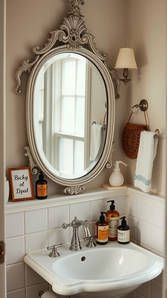 This bathroom showcases a delightful mix of vintage charm and modern convenience. The ornate mirror is a standout piece, adding a touch of elegance to the space. Its intricate frame draws the eye and reflects light beautifully, making the room feel more open.