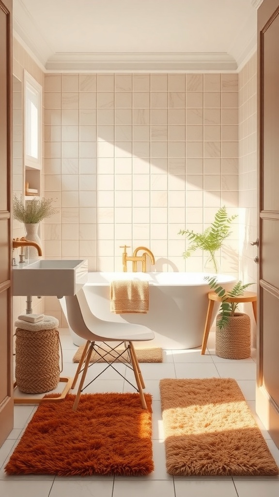 Cozy bath mats and rugs can really change the vibe of your bathroom. In the image, you can see a bright and inviting space featuring soft, fluffy rugs in warm shades of orange and tan. These colors add a cheerful touch, making the bathroom feel more welcoming.