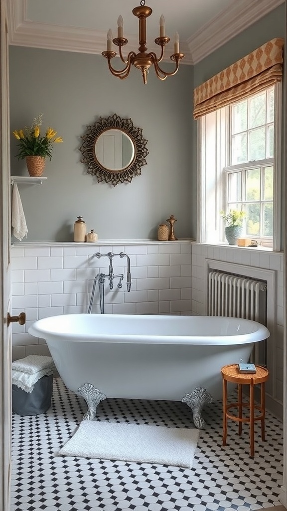 The soft color palette in the bathroom adds to the vintage feel. The light gray walls and patterned floor tiles create a cozy atmosphere. A stylish chandelier hangs above, providing warm lighting that enhances the overall look.