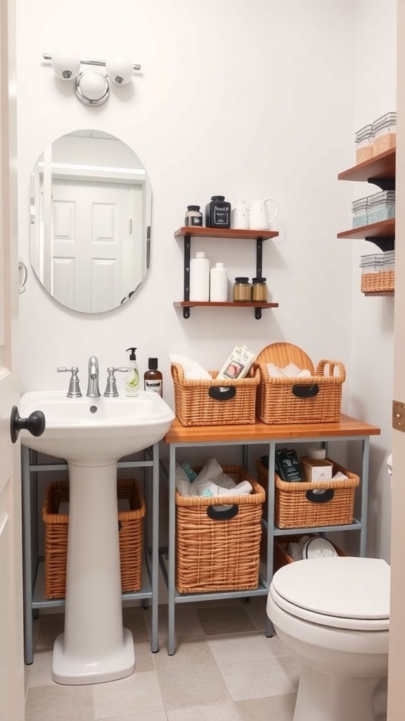Woven baskets are a fantastic way to keep things organized. They not only look great but also help hide clutter. You can easily store towels, toiletries, or even cleaning supplies in them. This setup shows that storage can be both functional and stylish!