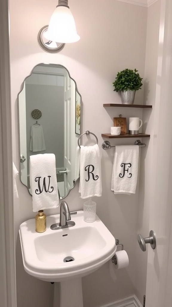 Adding a personal touch to your bathroom can make it feel more inviting and unique. In the image, we see a charming setup that beautifully illustrates this idea. The white towels, each adorned with a monogram, create a sense of individuality. This small detail can make a big difference in how the space feels.