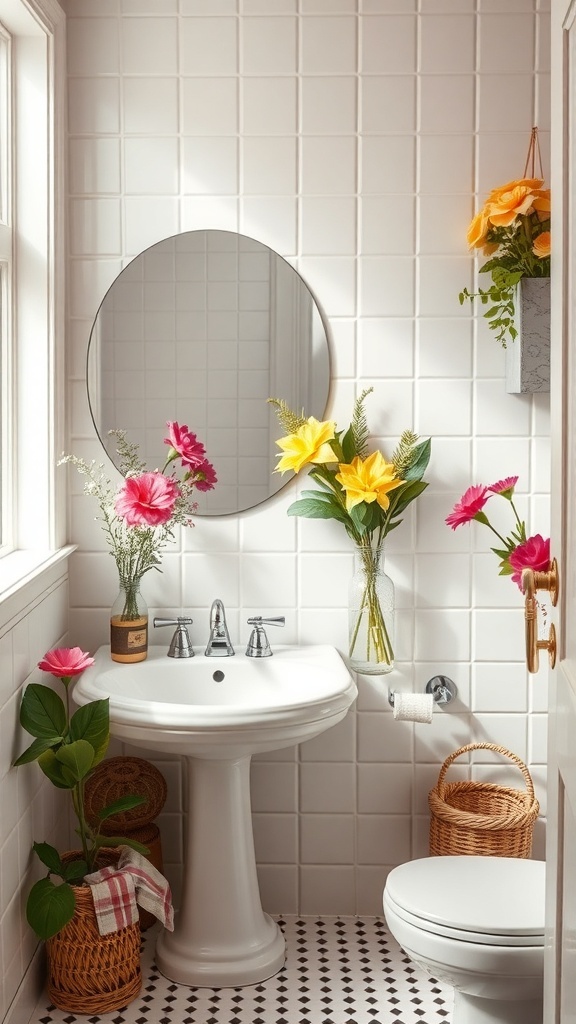 Fresh flowers can instantly brighten up any bathroom. In this charming space, vibrant blooms in various colors create a cheerful atmosphere. The pink and yellow flowers stand out beautifully against the white tiles, adding a pop of color that feels inviting.