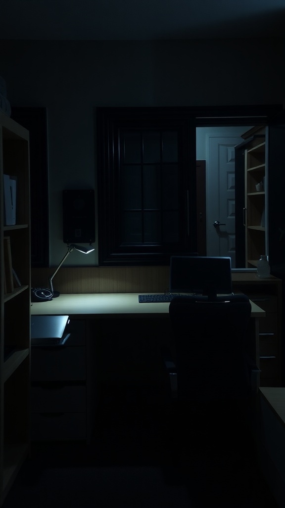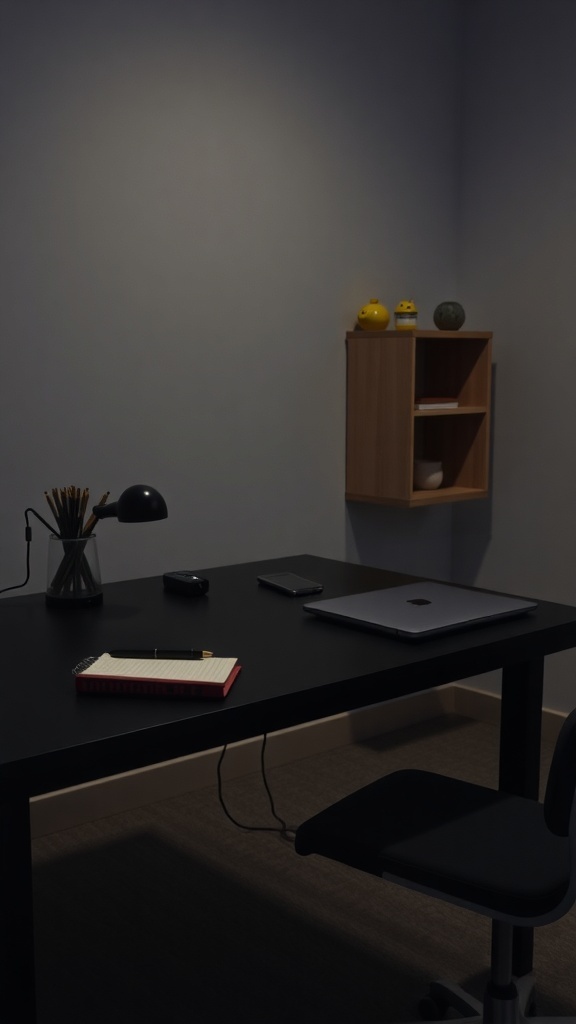 The desk features a laptop, a notebook, and a few stationery items, all neatly arranged. This setup encourages a clean workspace, which is essential for productivity. The soft lighting from the lamp adds a touch of warmth, balancing the darker elements of the room.