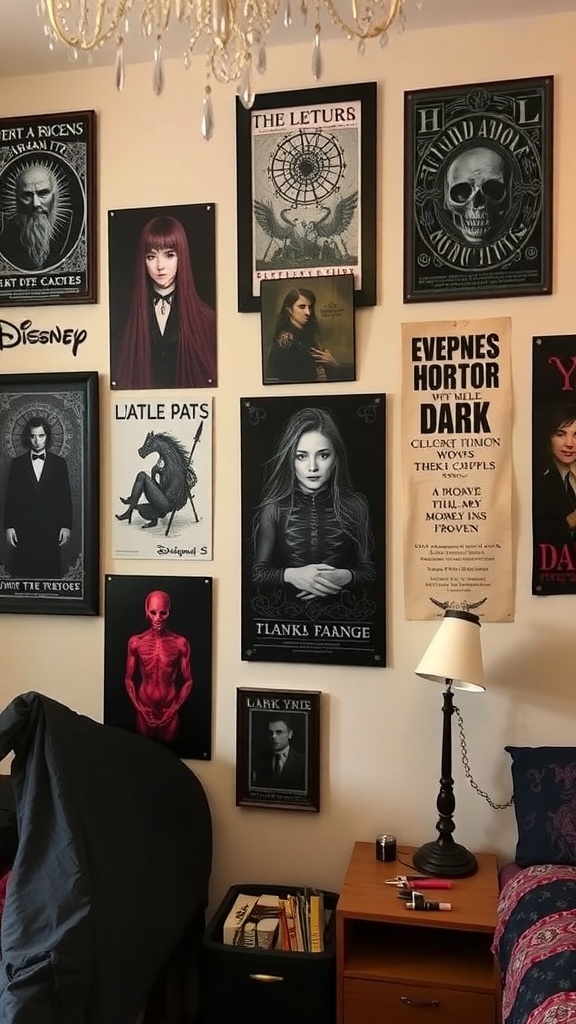 Gothic wall art and posters can transform your dorm room into a captivating space. The image showcases a wall filled with various dark and intriguing artworks. From haunting portraits to vintage-style posters, each piece adds a unique flair.