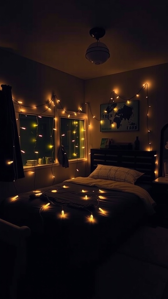 Fairy lights can transform a dark dorm room into a cozy retreat. The soft glow they emit creates a warm and inviting atmosphere. In the image, you can see these lights draped along the walls, adding a magical touch to the space.