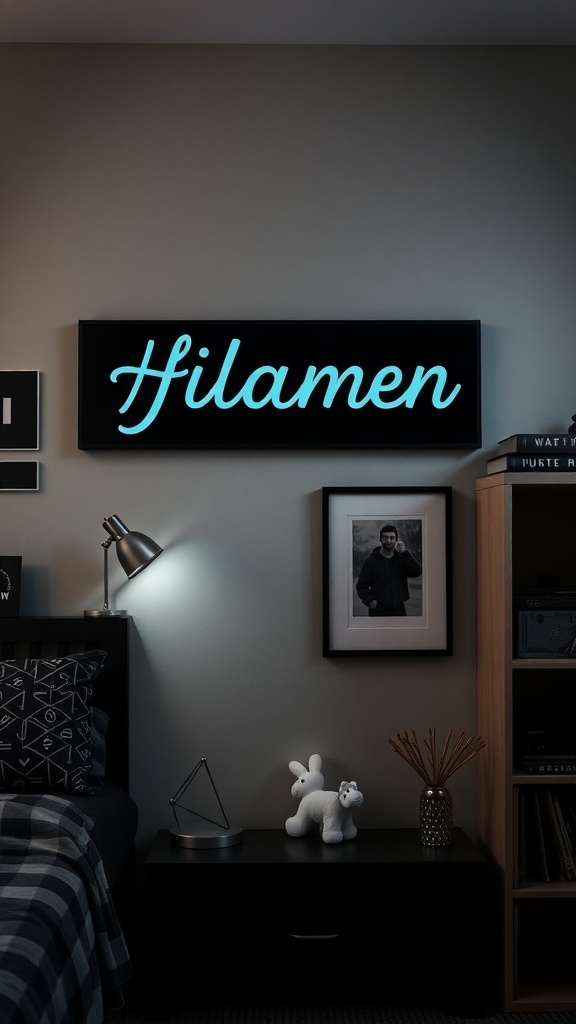 Creating a dark-themed dorm room can be a fun way to express your personality. The image shows a cozy corner with a stylish vibe. The neon sign adds a pop of color, making the space feel unique and inviting.