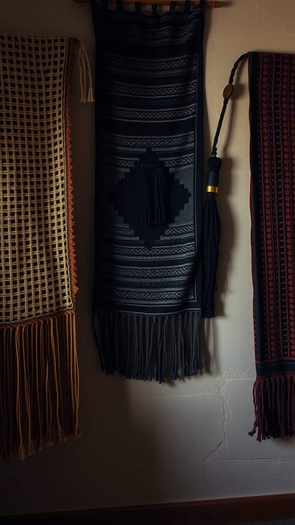 Textured wall hangings can really bring a dark dorm room to life. The image shows a trio of unique wall hangings that add depth and character to any space. Each piece has its own vibe, from the earthy tones of the woven fabric to the bold patterns of the darker hanging.