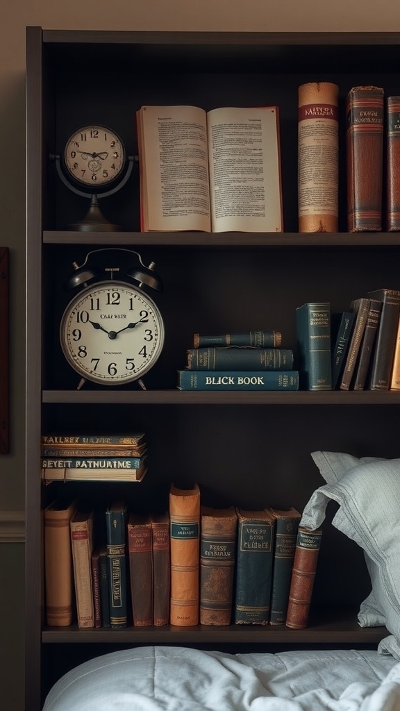 When it comes to creating a vintage dark aesthetic in your dorm room, accents play a key role. The image showcases a cozy bookshelf filled with an array of old books and classic decor. Each item tells a story, adding character to the space.