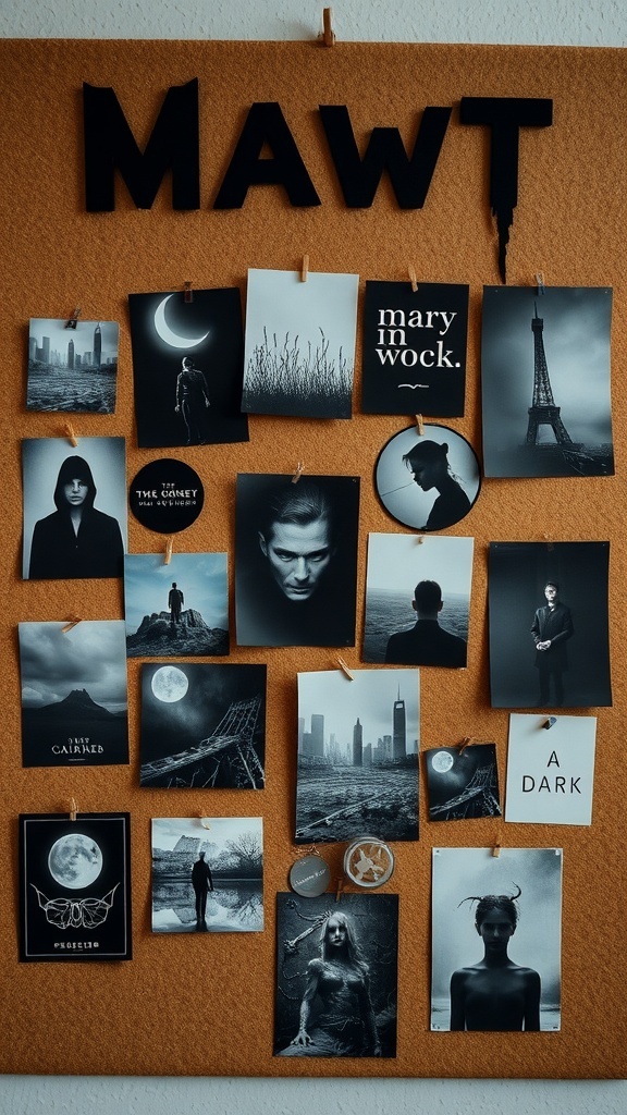 Mood boards are a fantastic way to express your style and vibe, especially in a dark dorm room setting. The image showcases a corkboard filled with striking black-and-white photos, each telling its own story. From haunting landscapes to mysterious portraits, these visuals create a cohesive dark aesthetic.