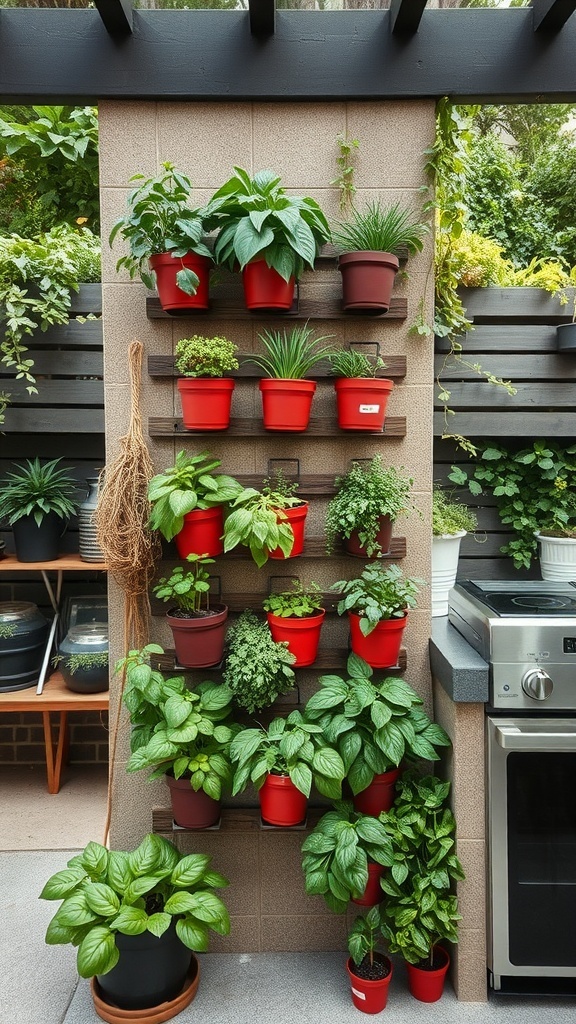 The image shows a well-organized vertical garden with various herbs and plants in vibrant red pots. This design makes it easy to access fresh herbs while cooking, enhancing your meals with fresh flavors.