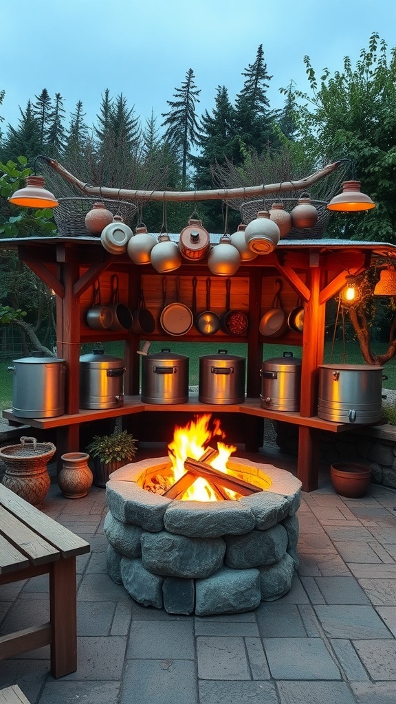 The fire pit itself is made of smooth stones, creating a cozy focal point. The flames dance, providing both light and heat. Above the counter, hanging pots and pans are neatly arranged, ready for use. This setup encourages creativity in cooking, whether you’re grilling, boiling, or roasting.