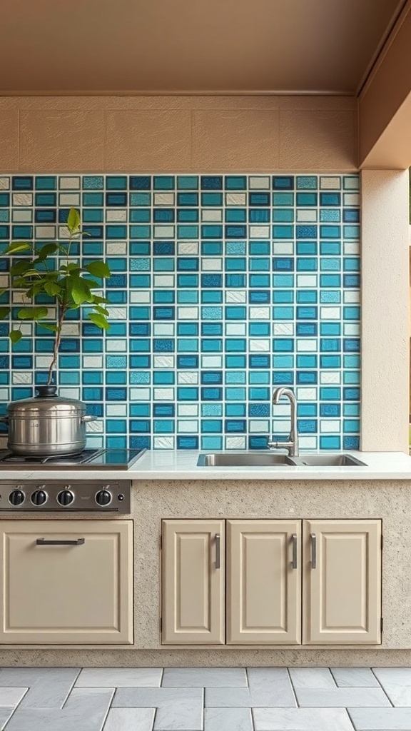 The tiles are arranged in a playful pattern, mixing different shades of blue with white accents. This design choice brings a sense of fun and creativity to the space. It’s a great way to express your style while cooking outdoors.