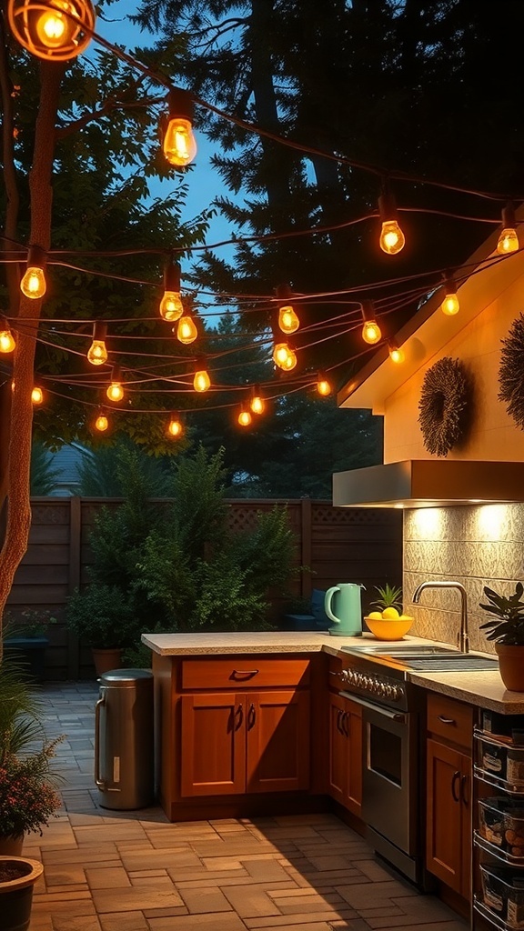 In the image, you can see warm, inviting lights strung above the kitchen area, casting a gentle light on the countertops and appliances. The combination of natural elements, like the surrounding trees and plants, adds to the charm. It’s a great way to blend functionality with a touch of magic.