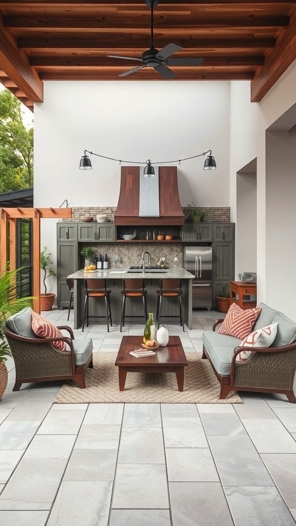 Behind the lounge area, you can see a well-equipped outdoor kitchen. This setup allows for easy access to snacks and drinks while enjoying the fresh air. The combination of the kitchen and lounge area makes hosting effortless.