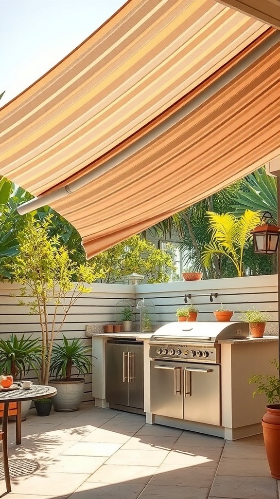 A retractable awning can be a fantastic addition to your outdoor kitchen. It provides much-needed shade, making cooking and dining more comfortable on sunny days. This image shows a beautifully designed awning that complements the kitchen area perfectly.